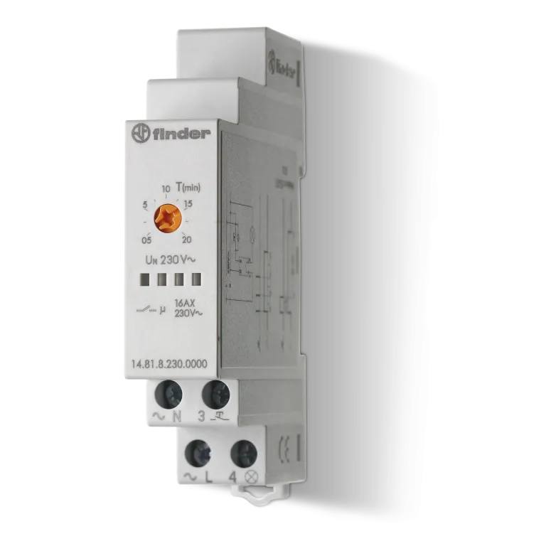 Automático de escalera monofunción (minutero escalera + limpieza de escalera) con los 4 terminales en el mismo lado. Dispone de un ajuste de tiempo de 30 s a 20 min, conmutación de la carga “zero crossing”, cableado compatible con versiones electromecánicas y con los antiguos pulsadores iluminados (de baja intensidad luminosa).