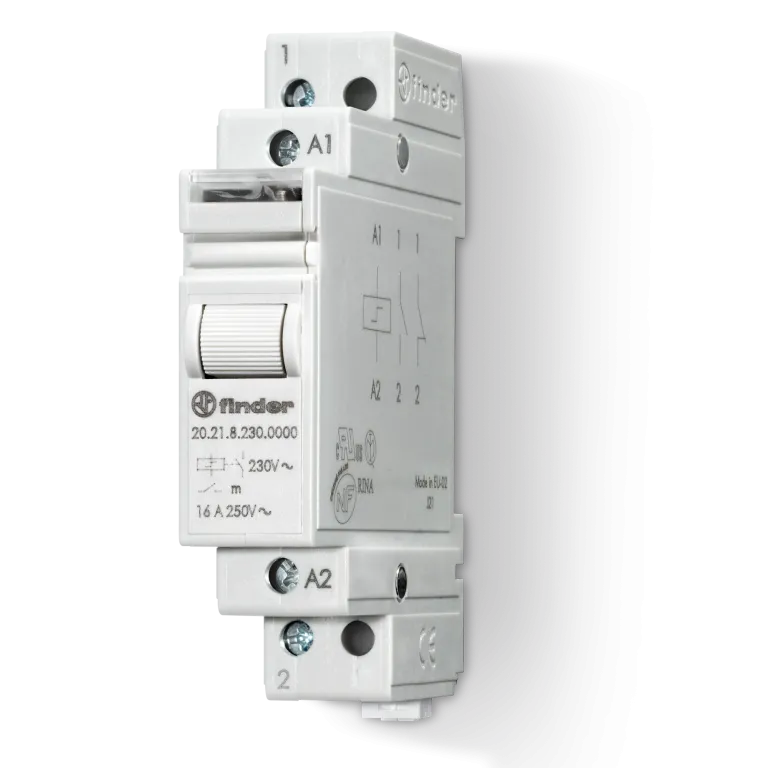 Telerruptor modular, 16A, con interruptor unipolar 1 NA, para el montaje en carril de 35 mm (EN 60715). Ancho de un módulo de 17.4 mm, pulsador de prueba e indicador mecánico, 7 secuencias disponibles, bobina de CA o CC.
