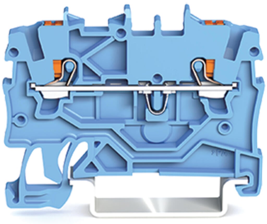 Clema de paso para 2 conductores con tecla 1,5 mm² con orificio de prueba, azul, Push-in CAGE CLAMP