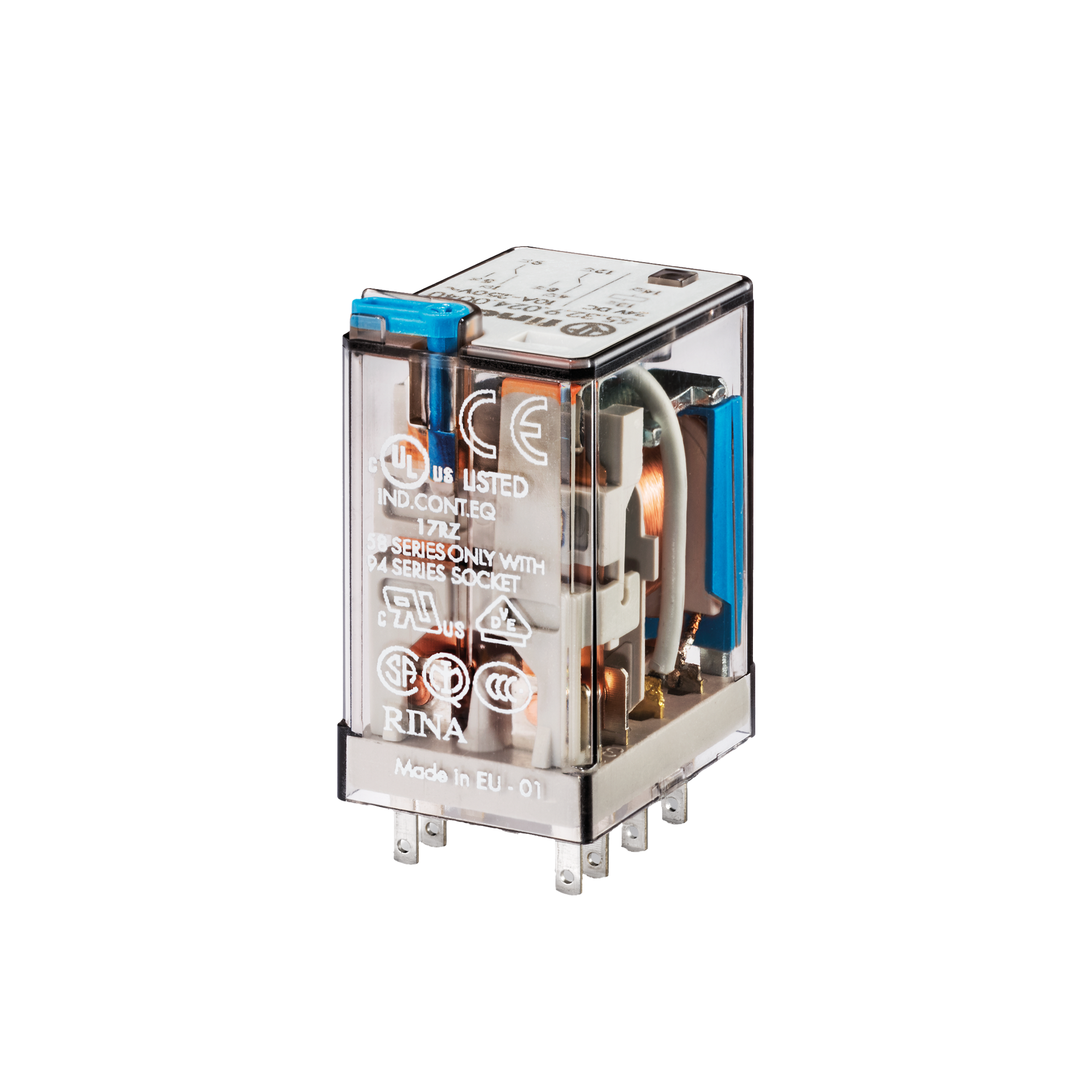 Relé industrial de uso general adecuado para montaje en zócalo de la serie 94, con 2 contactos conmutados de 10 A. Equipado con bobina de CA o CC, pulsador de prueba bloqueable e indicador mecánico estándar en 2 y 4 contactos. Variante con LED y módulo de protección integrado. Adaptadores disponibles para montaje alternativo. Patente europea.