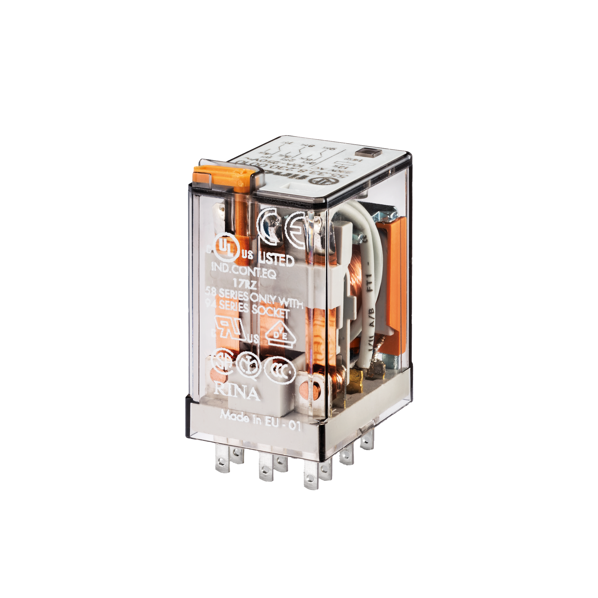 Relé industrial de uso general adecuado para montaje en zócalo de la serie 94, con 2 contactos conmutados de 10 A. Equipado con bobina de CA o CC, pulsador de prueba bloqueable e indicador mecánico estándar en 2 y 4 contactos. Variante con LED y módulo de protección integrado. Adaptadores disponibles para montaje alternativo. Patente europea.
