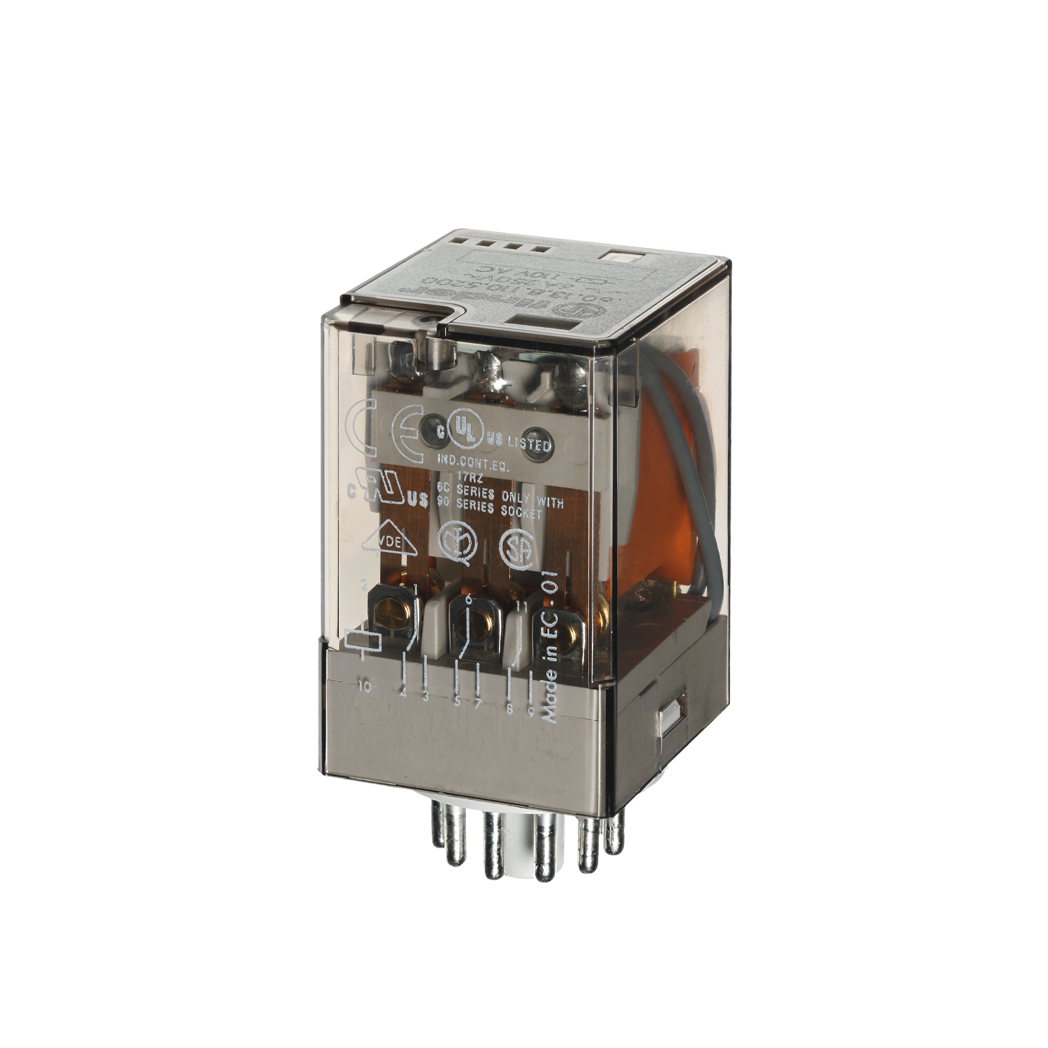 Relé industrial de 3 contactos de 10 A, Undecal, apto para montaje enchufado en un zócalo de la serie 90. Bobina de CA o CC, contactos sin cadmio, equipado con pulsador de prueba bloqueable e indicador mecánico (versión estándar).