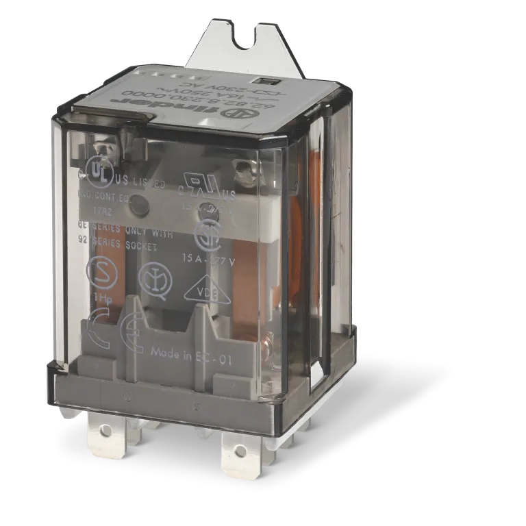 Relé de potencia de 16 A con 2 contactos conmutados. Terminales Faston 250 con aletas de fijación en la parte posterior. El tipo 62.82 tiene un aislamiento reforzado entre la bobina y los contactos según la norma EN 60335-1