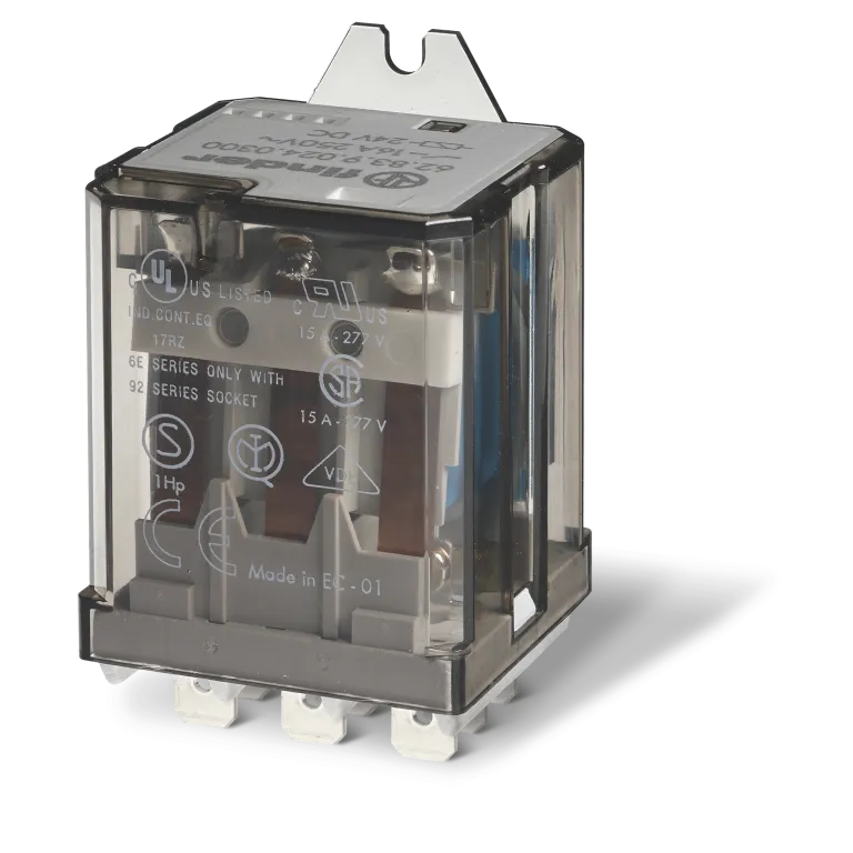 Relé de potencia de 16 A con 3 contactos conmutados. Terminales Faston 250 (6,3 x 0,8 mm) con aletas de fijación en la parte posterior. El tipo 62.82 tiene un aislamiento reforzado entre la bobina y los contactos según la norma EN 60335-1