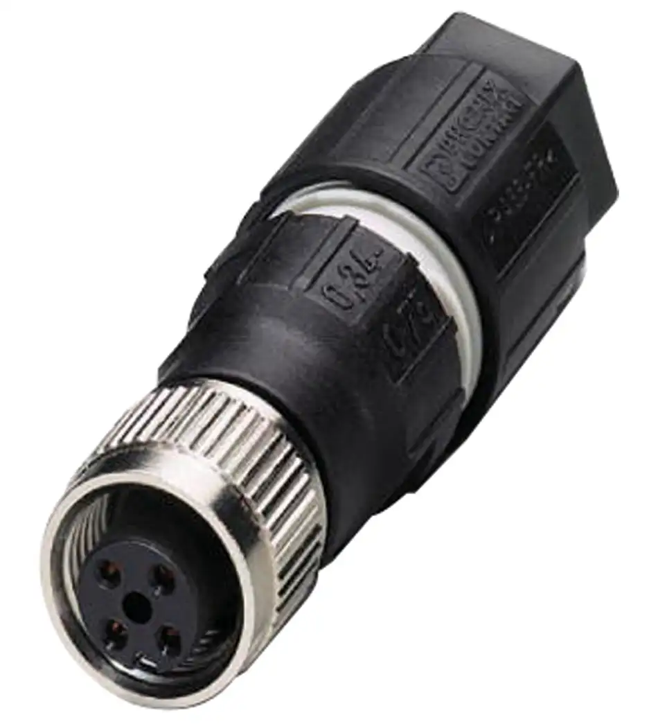 Conector hembra M12 recto, 4 pines, para cables de 4 a 8 mm de diámetro, montaje en campo, conexión por desplazamiento del aislamiento