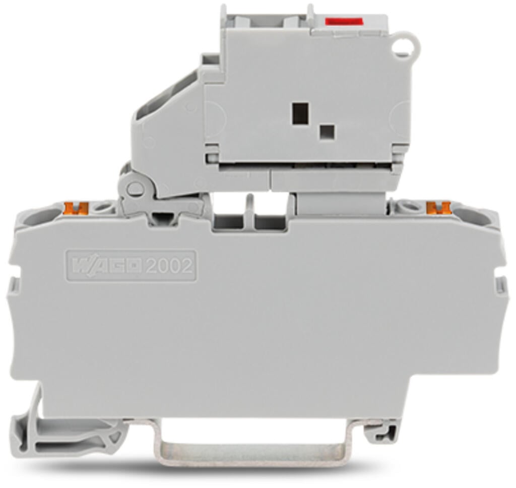 Clema portafusibles para 2 conductores; con portafusible basculante; con placa final; para fusible tipo G 5 x 20 mm, gris, Push-in CAGE CLAMP